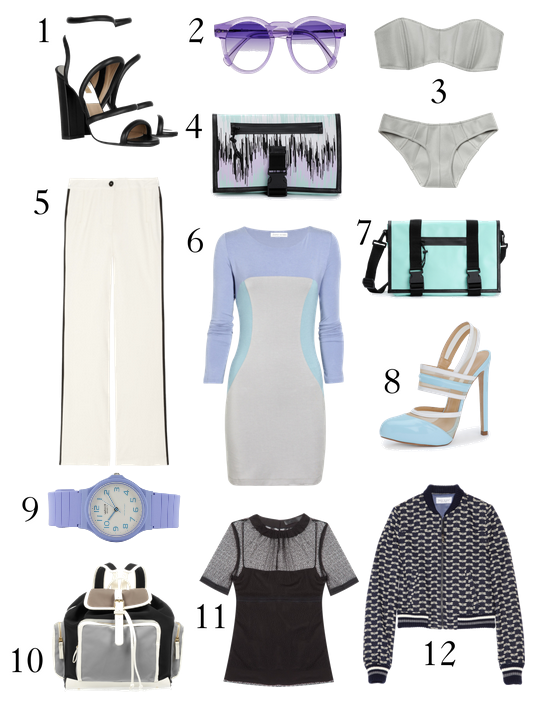 1- Michael Kors shoes, 2-Illesteva sunglasses, 3-Lisa Marie Fernandez bathers, 4-Versus clutch, 5-Adam pants, 6-Jonathan Saunders dress, 7-Versus clutch, 8-Versus shoes, 9-Casio watch, 10-Pierre Hardy backpack11-Proenza Schouler top, 12-Paul&Joe jacket)