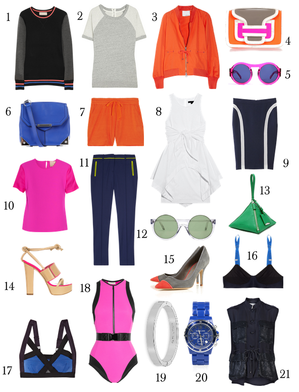 (1-Jason Wu pullover, 2-Aubin & Wills tshirt, 3-3.1 Phillip Lim jacket, 4-Pierre Hardy clutch, 5-Karen Walker sunglasses, 6-Alexander Wang bag, 7-3.1 Phillip Lim shorts, 8-Alexander Wang dress, 9-Rag & Bone skirt, 10-Roksanda top, 11-Jason Wu pants, 12-Henry Holland for Le Specs sunglasses, 13-Jil Sander bag, 14-Christopher Kane shoes, 15-Gilmore shoes, 16-VPL bra, 17-VPL bra, 18-Michael Kors bodysuit, 19-Michael Kors bangle, 20-Michael Kors watch, 21-3.1 Phillip Lim vest)